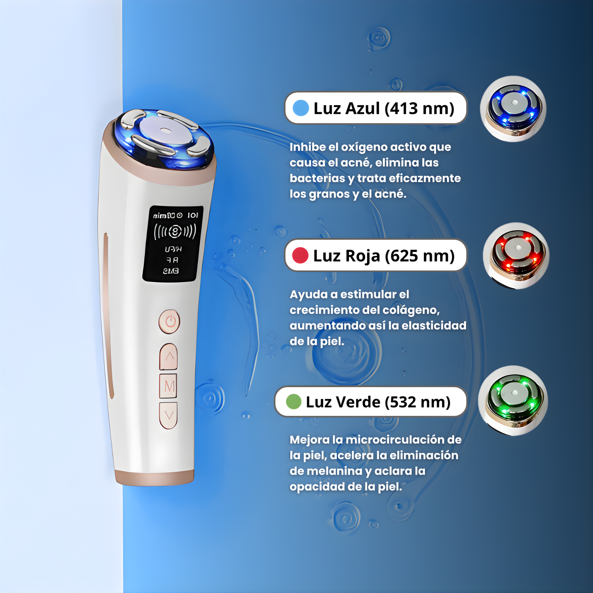 Inspirado en los tratamientos profesionales de los mejores centros estéticos, este dispositivo de última generación estimula la producción natural de colágeno y elastina, reafirmando la piel, mejorando su textura y devolviéndole su luminosidad natural.